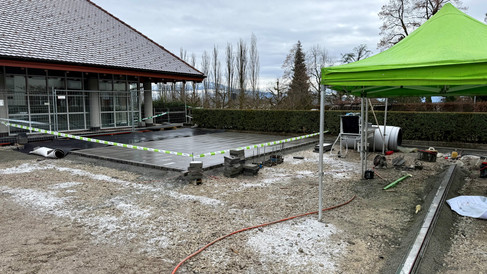 Der erneute Wintereinbruch mit tiefen Temperaturen führte zu einem Unterbruch der Arbeiten im Aussenbereich. Anfangs dieser Woche konnten die Arbeiten wieder aufgenommen werden.